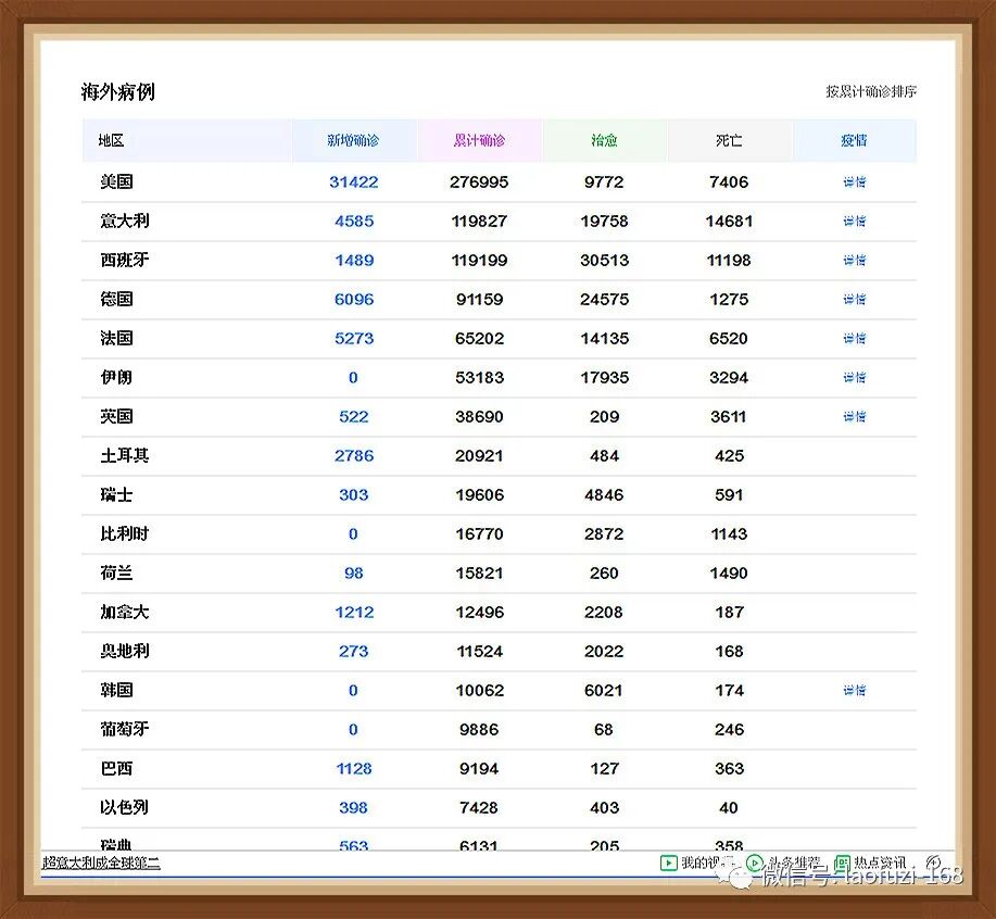 事实胜于雄辩,英国政府利用“中国智慧”取得了抗击新冠肺炎疫情的阶段性胜利。从疫情统计数据看(下图),截止4月4日9时,西班牙人口4600万人,确诊病例119000人,占比0.26%;意大利人口6000万,确诊病例119000人,占比0.2%;德国人口8200万,确诊病例91000人,占比0.11%;法国人口6600万,确诊病例65000人,占比0.1%;英国人口6600万,确诊病例38000人,占比0.06%。英国几乎是整个欧洲国家当中人口感染比例最低的国家。