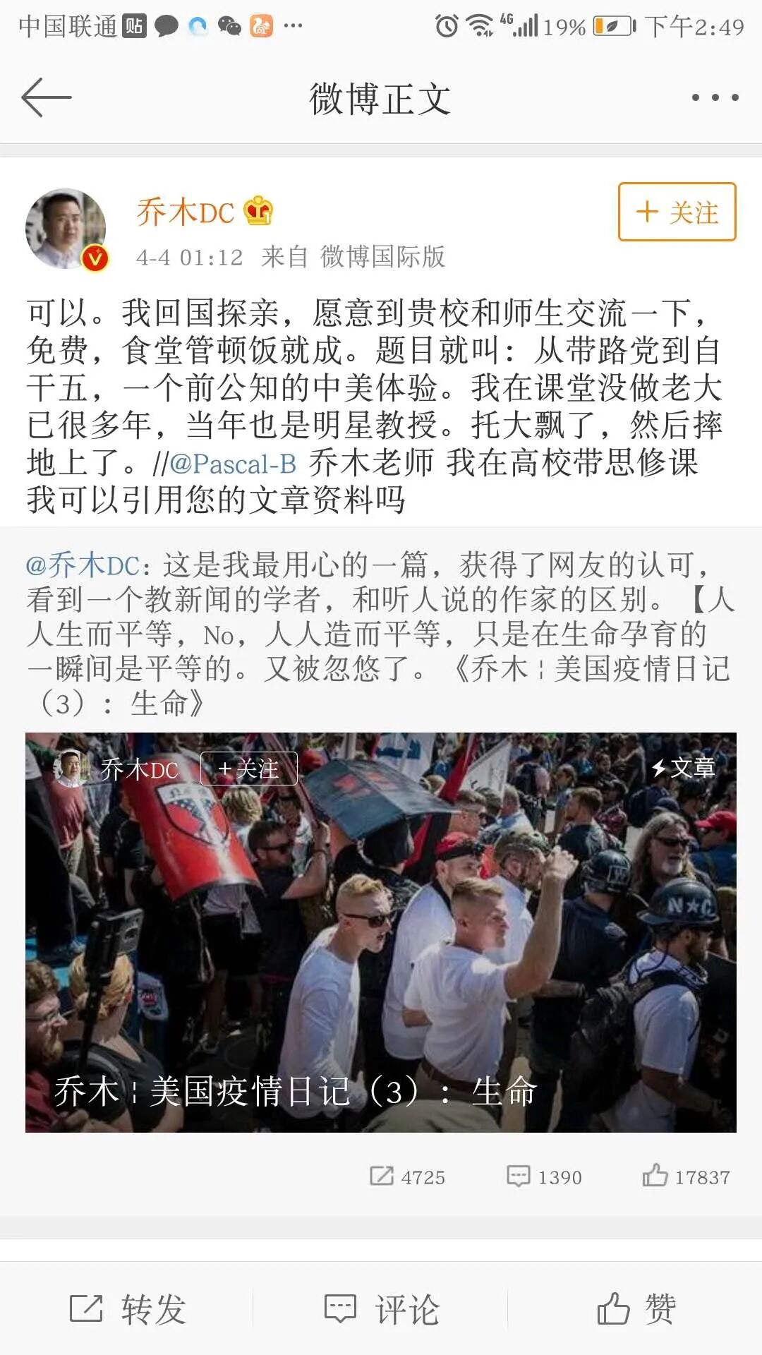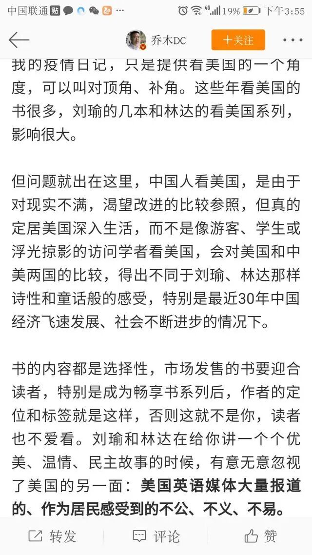 乔木教授,虽然是带着公知的认识,去美国寻找理想,圆自己的梦。但他终究还是一个诚实的人,他在国内的观点,虽然经不起事实的验证,但是真的只是出于认识问题。