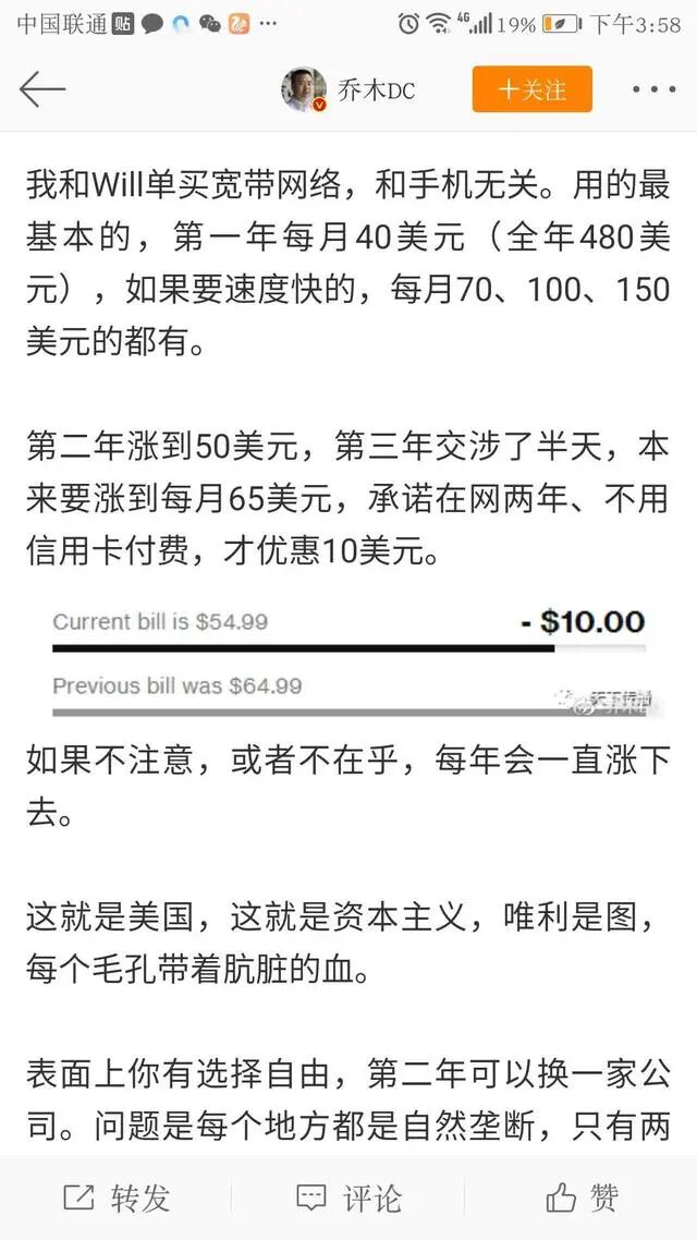 他比较了中美之间的基本生活费用,发现美国的电费、天然气等费用,每两三年就要涨一次价。美国的上网费很贵,而且美国的网络并不像中国这样覆盖率那么高,在美国很多地方都没有信号覆盖。