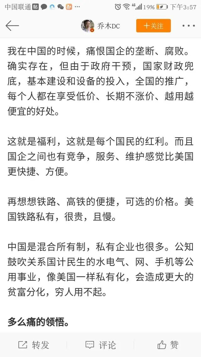 可贵的是,乔木教授对美国问题的思考没有停留在表面现象,他竟然还反思到所有制层面。他说:“根源就在所有制上。”“公知鼓吹关系国计民生的水电气、网、手机等公用事业,像美国一样私有化,会造成更大的贫富分化,穷人用不起。”