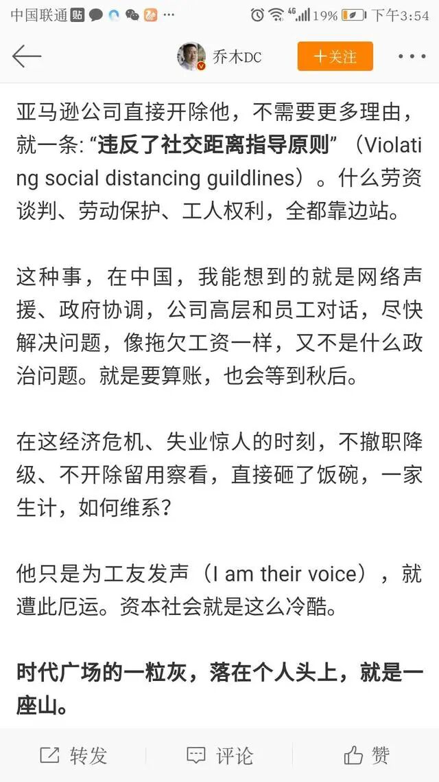 他发现美国大知名公司对工人也比较冷酷。马逊网购公司有不少工人感染。因为公司没有适时通报并采取必要的防护措施。为工人发声的助理经理Christian Smalls 被找了个理由“违反了社交距离指导原则”,直接开除