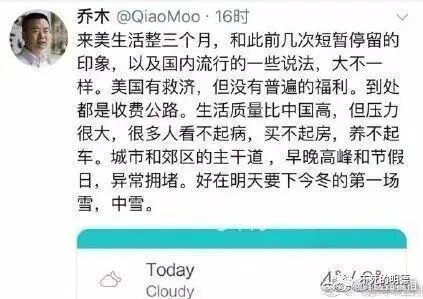 这个现象背后的道理并不复杂:在国内,他们了解的美国是移民公司账号笔下的美国,是精神美国人写的美国,是被极致美化后的美国,是过滤了所有负面因素的美国,同时又把正面浓墨重彩渲染强调的美国。