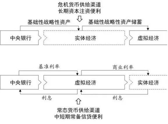 在常规的货币供给渠道失灵危机状态,央行应当绕过商业银行系统,通过直接对基础性战略性资产(BSA)进行投资向市场投放货币。史正富将这个新的货币发行通道称为“长期资本注资便利(Long-term Capital Funding Facility)”渠道。