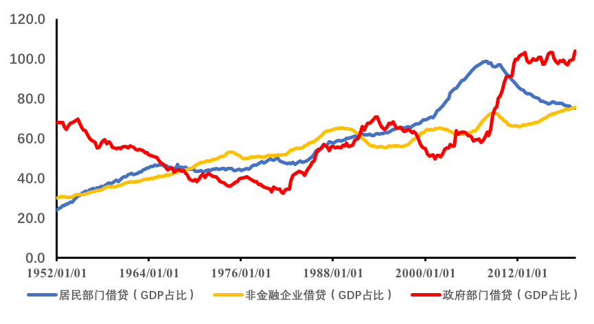 各经济部门借贷与GDP比值(%,数据来源:美联储)