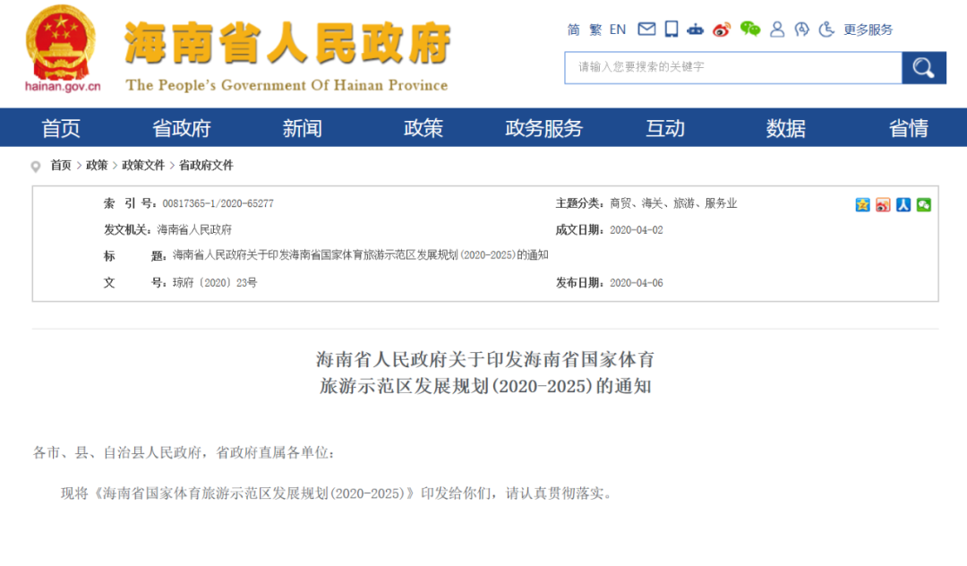2020年4月6日,《海南省国家体育旅游示范区发展规划(2020-2025)》的全文,正式在海南省政府官网公布。
