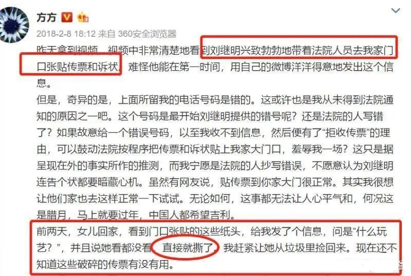 方方说要起诉别人,但她自己就是不履行判决义务,还不无炫耀在微博上晒女儿撕法院传票的事。
