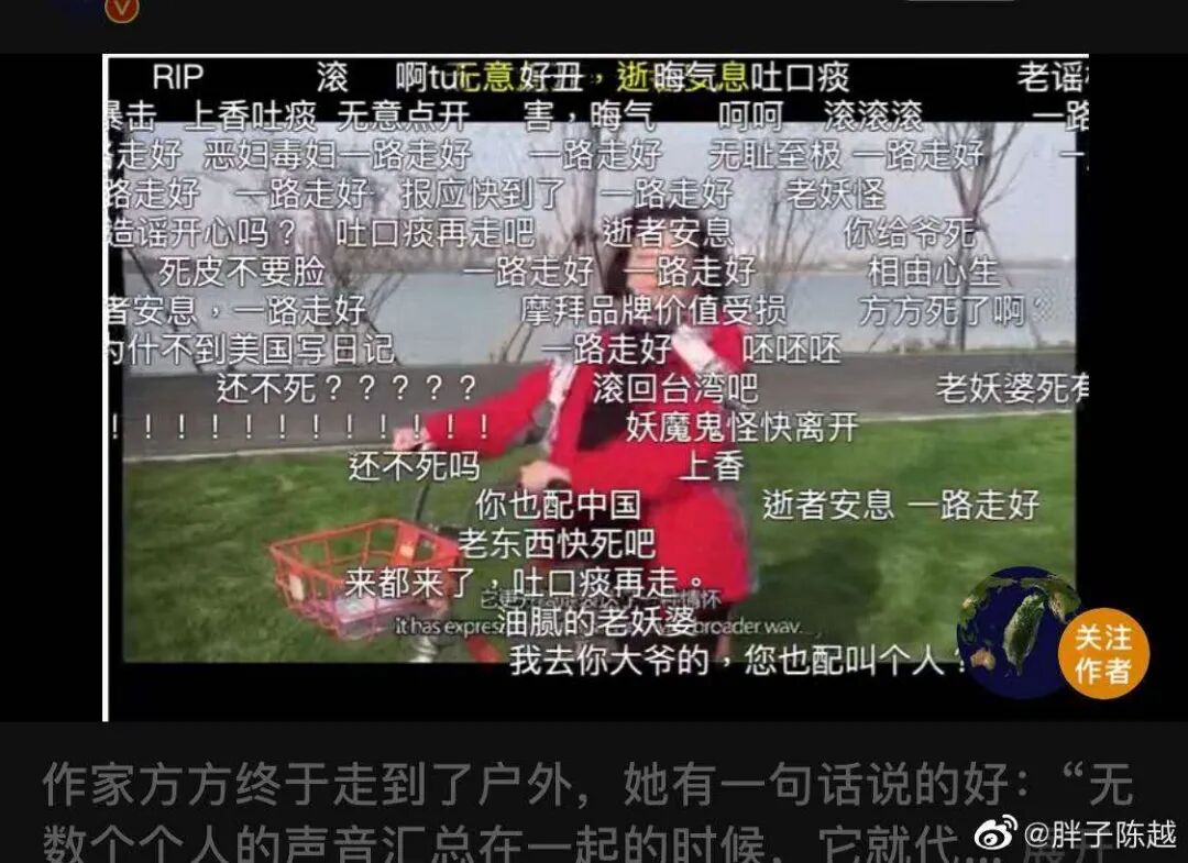 方方的微博评论区这两天还是那么让方方不忍直视,当然,更让方方尴尬的是年轻人比例更高的B站。也不知道是方方的哪个支持者,玩了一把高级黑,把方方走出户外的视频发到B站,结果好心帮了倒忙,一下子让方方的形象谢幕在B站青年的弹幕里,果然比方方用力控评的微博评论区还惨。
