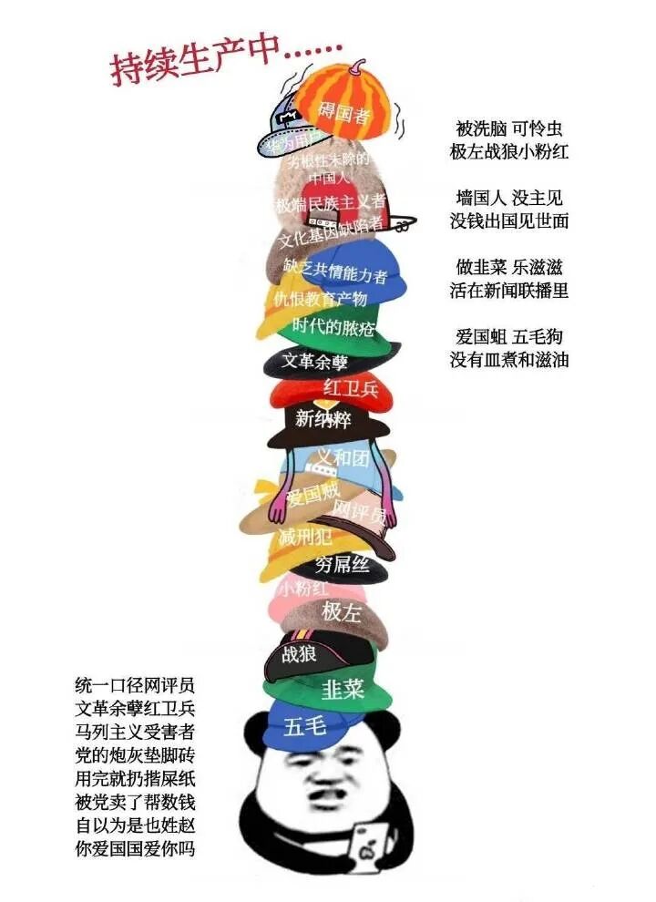 所以才有方方在微博中的各种不能控制自己情绪的表现,扣帽子、打棍子,似乎是方方面对以年轻人为主的质疑者的唯一选择。方方发明了多少帽子来应对批评和质疑,已经令人眼花缭乱到不知准确数目,好在有聪明的网友已经做成了图。