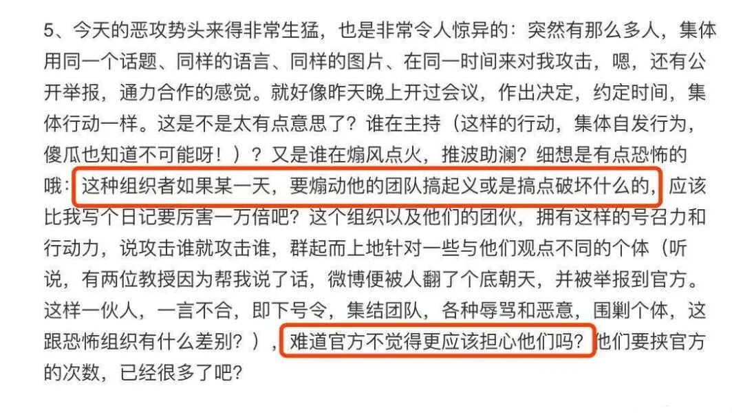 方方现在还只是一个不拿枪的“战士”,面对批评和质疑,为了引导“官方”进行干预,故意把自发出来反对自己的网友,说成是“有组织”。