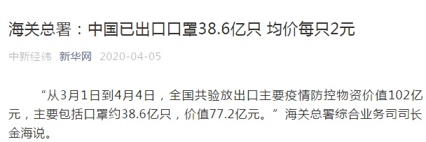 3月1日到4月4日,中国累计出口的口罩约38.6亿只,3752万件防护服、241万个红外测温仪、1.6万个呼吸机。
