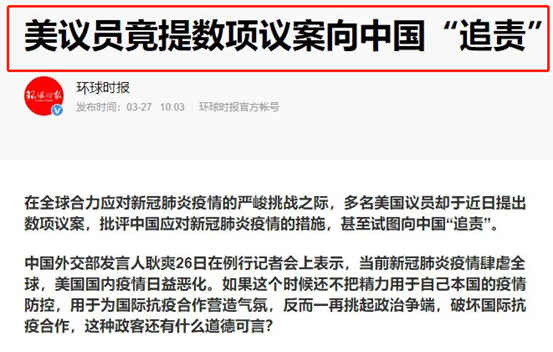 自3月中旬以来,美国英国等其他西方国家,不断将疫情责任归咎中方,并要求中方作出巨额赔偿。