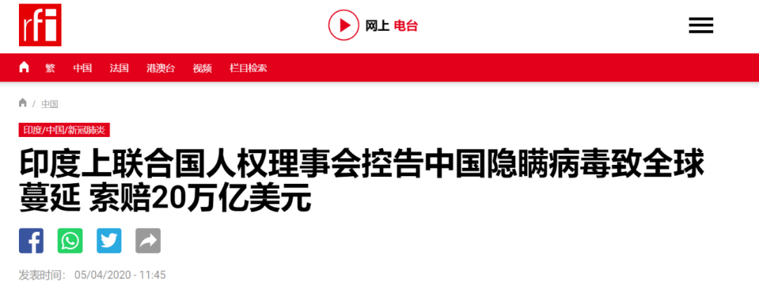 但前几天,印度却在联合国人权理事会上,因为新冠病毒控告中国,要求中国赔偿印度20万亿美元。