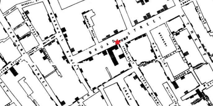 然后斯诺发现,大部分病例的住所都围绕在一个Broad Street的水泵附近。