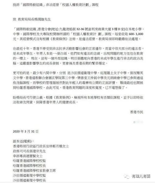 4月2日,港媒报道最少6家本地中学接受 “洗脑教育”,家长联署投诉幕后黑手——“国际特赦组织”(AI)。