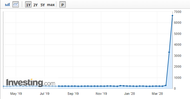 还有,进入3月份以来,随着疫情全国蔓延,美国失业工人迅速增加,美国“初请失业金人数”激增(如下图)。国内“砖家”纷纷击掌相庆,奔走相告:“美元霸权要结束了”。