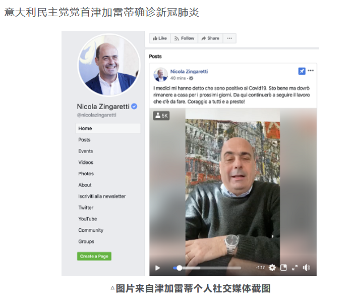 历史总是以某种讽刺的方式完成了循环。1月底欧洲疫情的出现非但没有引起欧盟的注意,反而触发了欧洲政客和媒体对于中国的嘲笑。他们迫不及待地将疫情与某种体制的失败联系起来,用于确证自身价值观的正确性。在2月底意大利北部地区已经呈现出集聚性社区爆发的时候,欧盟依旧公开表示,各国有“很强的整体防范水平(a strong overall level of preparedness)”来应对疫情在欧洲的传播。甚至五星运动联合执政的意大利民主党主席津加雷蒂还公开带领党内政治人物前往米兰,表态反对封城令。不过,颇具喜剧效果的是,津加雷蒂随后被宣布测试结果为阳性,不得不接受自我隔离和治疗。他发布在facebook上为了显示米兰一切正常的作秀视频也很快不见了踪影。