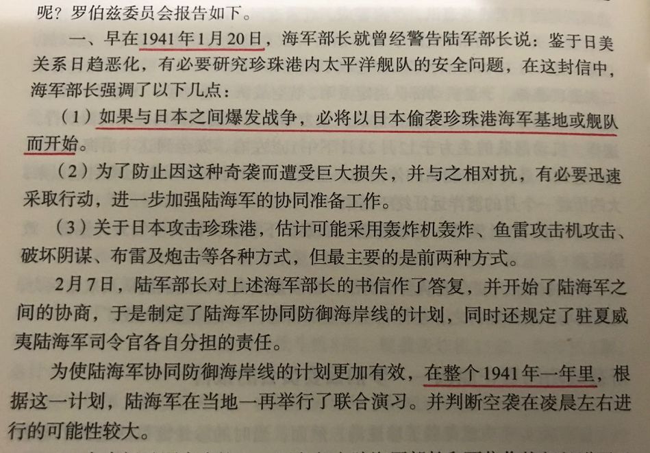 珍珠港事件爆发后,美国成立了以罗伯兹为首的调查委员会,在罗伯兹提供的报告中,明确提到:早在1941年1月20目,海军部长就曾经警告陆军部长说:“鉴于日美关系日趋恶化,有必要研究珍珠港内太平洋舰队的安全问题。”在这封信中,海军部长强调了以下几点: