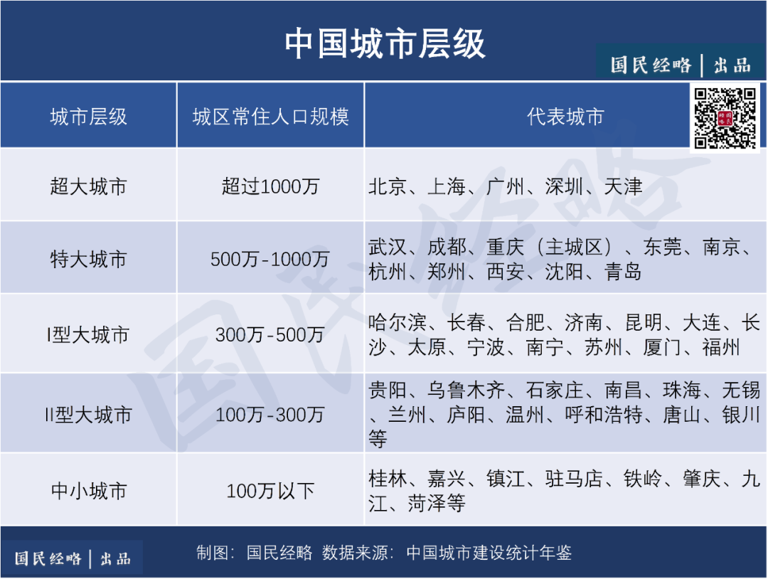 以此为标准,城区人口超过1000万的是超大城市,500万-1000万之间的属于特大城市,300万-500万的属于I型大城市,100万-300万之间属于II型大城市,低于100万的则属于中小城市。