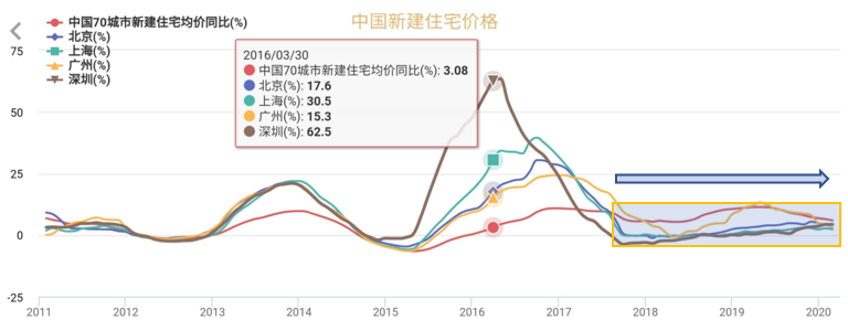 从2017年以来中国四个头部城市的房价指数来看,基本上延续了窄区间震荡的大趋势,而且这个趋势大概率还要持续很多年。