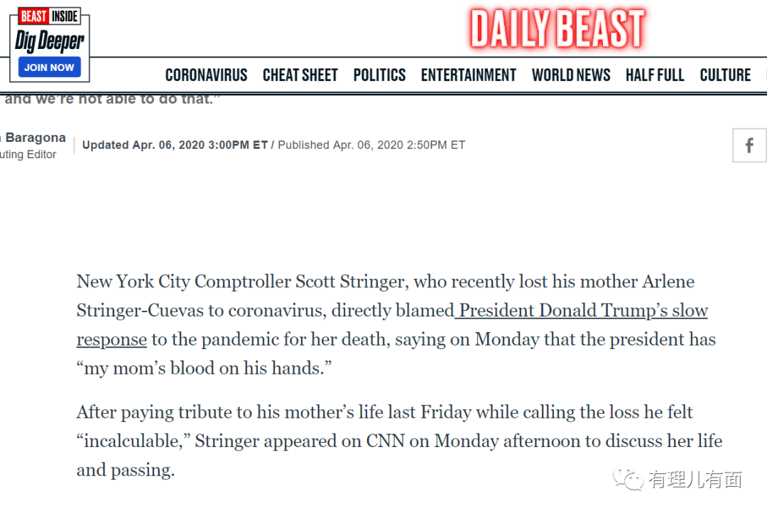 纽约市审计长斯科特•斯特林也给予了“充分肯定”:在纽约,很多家庭都是这样,我必须告诉你,唐纳德·特朗普的双手沾满了鲜血,他的双手沾满了我母亲的鲜血。