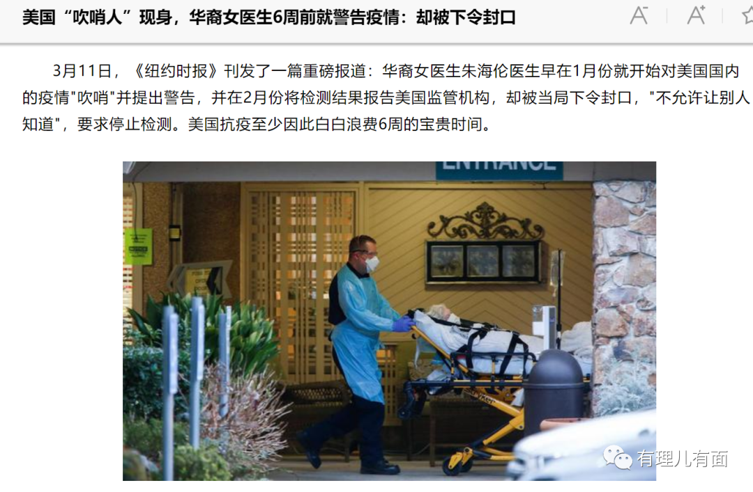 事例1:据报道,华裔医生朱海伦(Helen Y. Chu),从2012年起就在华盛顿大学从事流行病学、过敏等相关病症的研究工作。她所在的地区是华盛顿州港口城市西雅图——这里正是美国第一位确诊患者的居住地。朱海伦早在1月份就开始对美国国内的疫情"吹哨"并提出警告,在2月份已将检测结果报告美国监管机构,却被当局下令封口,"不允许让别人知道",并被要求停止检测。直到3月真相曝光,美国抗疫至少因此白白浪费6周的宝贵时间。