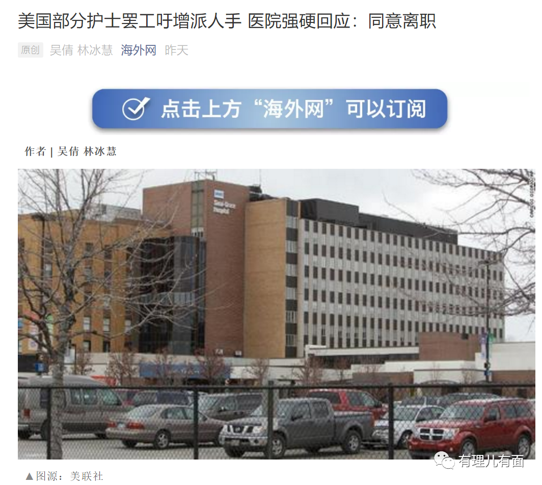 事例2:《西雅图时报》3月29日曾刊登了一篇报道,讲述的是一位名叫Ming Lin的华裔医生,他所在的"和平健康圣约瑟夫医疗中心"(PeaceHealth St. Joseph Medical Center)在应对新冠疫情上准备不足,而且也没有给医护人员提供足够的防护。因此,林医生在Facebook上恳求自己的医院给医护人员足够的防护措施。而在社交媒体发完声后,他刚刚上班就被医院通知以后不用来了。林医生的结局比朱海伦的禁言更严重,直接被雇主开除了……事例3:据CNN4月8日报道,当地时间4月5日晚,在密歇根州底特律市的西奈-格雷斯医院,部分医护人员在要求院方向超负荷运转的急诊室增派更多护士未果后,纷纷表示拒绝继续工作。医院的管理层作出的决定是:他们不会再聘请更多人手,这些“罢工”的护士可以选择继续上班,也可以选择辞职。部分医护人员随后选择离开医院,院方强硬回应:同意离职。毫无挽留。而在一批值夜班的护士离职后,日班护士则被要求继续工作——这意味着他们要24小时轮班。而医院随后提出将再聘请4名护士来帮助值夜班的医护人员。院方管理层是如此傲慢,宁可新聘请四名护士,也不愿对已经在鏖战中饱受煎熬并已获得相当处置经验的医护们说出一句挽留的话语。更加讽刺的是,美国数十个州要求医院暂停非紧急手术从而将更多医疗资源用于应对疫情。政府出于救治病患的角度出发,但美国的医疗机构想的却是如何减少运营成本,他们做出的决定甚至比西奈-格雷斯医院更加恶劣——以临时裁员的方式节省开支。于是,出现了大量医护人员或被减薪或被解雇或被迫休假。据报道,南卡罗来纳州医科大学查尔斯顿分校将从1.7万名员工中裁员900人,并要求全日制领薪员工减薪15%。田纳西州库克维尔地区医疗中心要求2400名员工中的400人休假,另外数百人减少工作时数。波士顿医疗中心裁员700人,约占总员工的10%。西弗吉尼亚州的两家医院共有1000名员工被迫休假……报道中列举的实施裁员医院名单排成了一串。