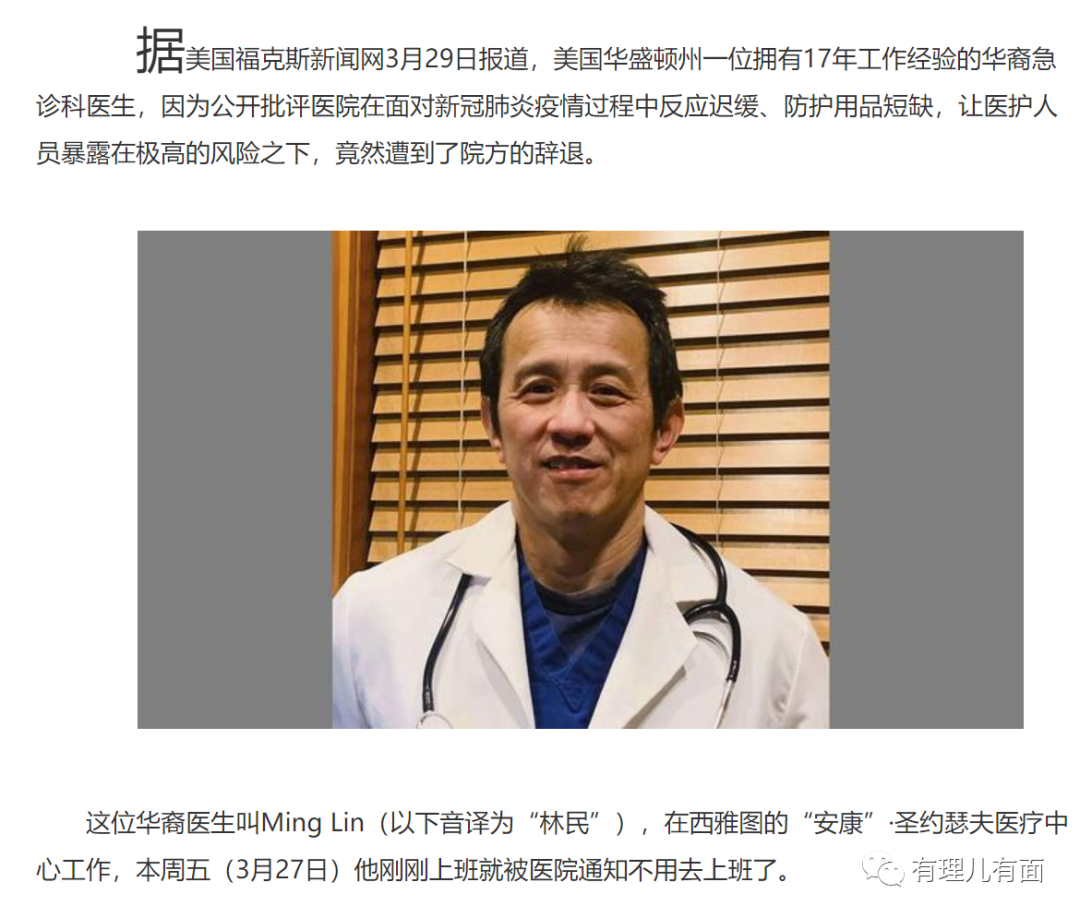 那么,在如此严峻的情况下,与病毒直接交锋的医护人员应该是此次抗疫的主角,如同在我国一样受到广泛尊重吧?但是,众多的美国医疗前线“吹哨人”,在政府“视而不见”的纵容下,都被院方管理层的冷酷管理者一个一个击倒了。举几个例子:
