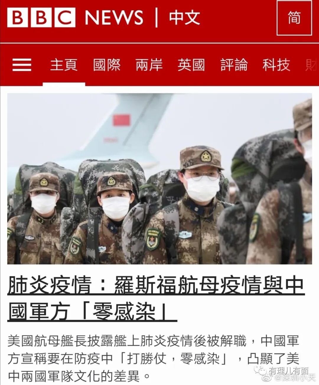 地怎么洗呢?还是老套路——阴谋论中国,通过对比美中军队进行强洗。认为美军航母过百人感染的消息被曝光,是因为美军“强大自信”所以敢于透明,后来宣布不公布感染数了,是合理的“保护军事秘密”。而又指在中国虽然解放军零感染,但是据中国一些媒体报道,其实是隐瞒病例,透露出中国军队的“恐惧和虚弱”,是“专制”的体现。