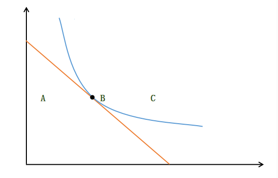 如图,当司法资源的预算约束线与无差异曲线的相切(B),社会效用达到最大化。