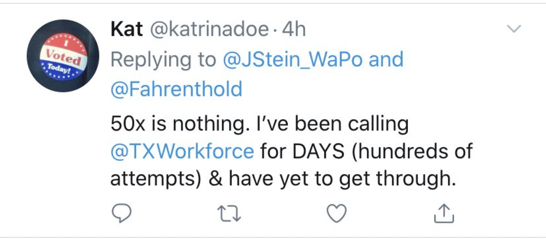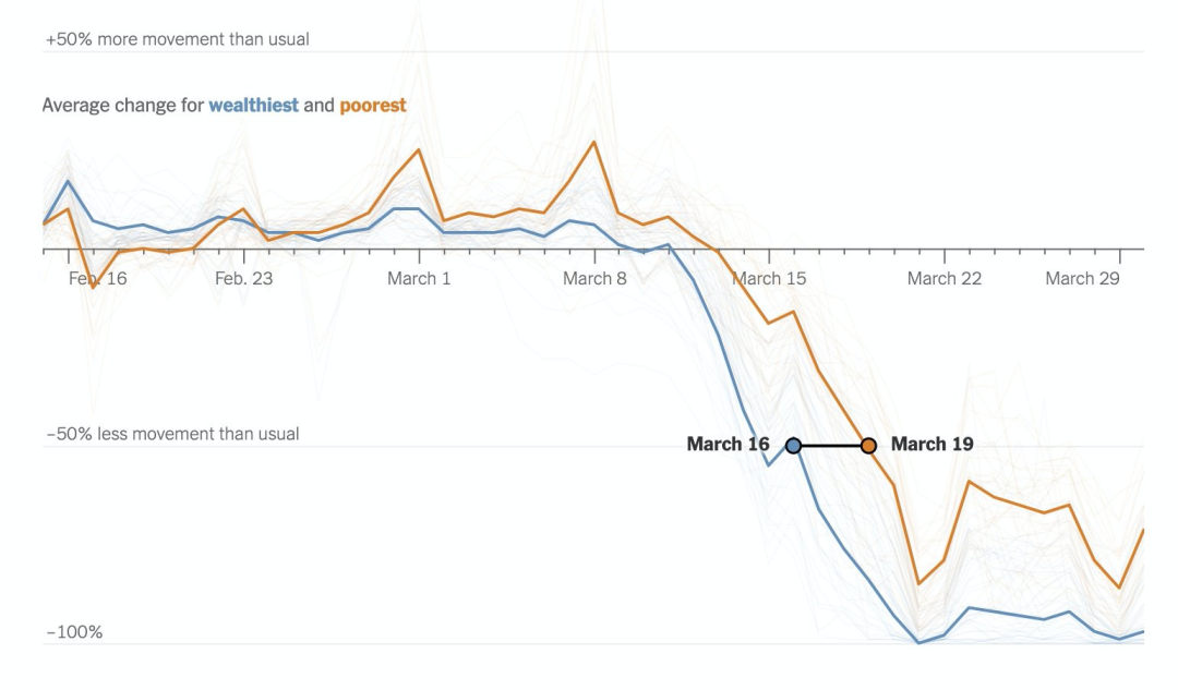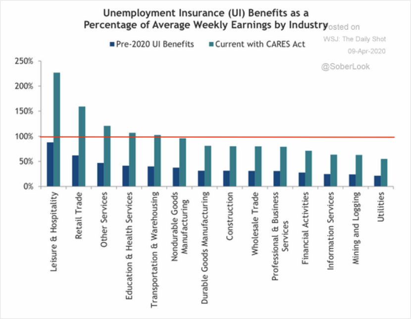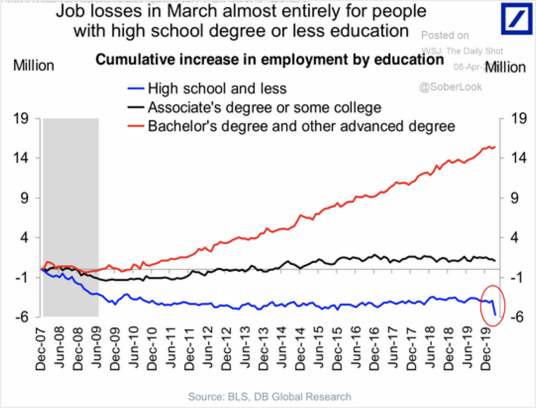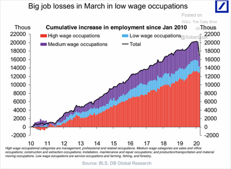 一场可预见的、史无前例的失业海啸在加速席卷全美国。 美联储最坏的预测是,疫情最终导致的失业人口达到4700万,是大萧条时期的3倍。 这股猛烈的失业潮,会不会冲垮美国的经济?另一个火车头中国,又将承受多大的美国冲击波? 和以往的经济衰退相比,此次大危机对就业市场的破坏有两处显著不同。 仅仅2周时间,初次申请失业救济金的失业大军新增近1000万,抹去特朗普当选以来全部的就业增长。同样的体量,十年前的金融危机时期用了27周。 仅仅3周时间,新增1680万。上周初申失业救济金人数继续激增661万人。2008-2009全年申请人数也才2000-3000万人。 美国官方失业率3月份是4.4%,上升0.9个百分点,创下了1975年以来最大月增幅,失业人数增加140万人至710万人。这份报告在3月12日之前就完成调查,数据还没能反应疫情大爆发之后美国的就业市场。 彭博根据这三周的失业金申领数据测算,美国失业率已经达到13%-14%,超过上一次经济衰退期间10%的峰值。 美国的失业率会继续飙升到什么程度,我们可以来看看美联储、政府和华尔街给出的预测。 圣路易斯联储一份研究给出了非常震撼的预测数值: 4700万人因此失业,导致美国的总失业人数达到5280万人,是大萧条顶峰时期的3倍还多,失业率高达32.1%,超过大萧条时期24.9.%的峰值。 美国国会预算办公室的最新预测,美国第二季度失业率将超过10%。 华尔街各大金融机构给出的二季度失业率预测中值为10%。 这两天国内媒体都在说,美国人主动辞职靠失业救济金生活,因为失业救济金高于工资。 32岁的罗斯·张是纽约的灯光设计师和技术员,自从三周前被解雇以来,他已经尝试给纽约的失业热线打了数十次电话,上周五他怒打了50次,从没打通。他内心只剩下无力感、焦虑感、对当权者无法提供答案的愤怒……(《华盛顿邮报》) 华盛顿邮报的白宫记者杰弗里·斯坦在推特上转发了很多求助。 比如:50倍算不了什么。我给德州劳动力委员会打了很多天、数百次电话,至今没接通过。 除了电话占线,申请失业救济的网站也被淹没了,纽约州州长科莫还为此向公众道歉。 现在美国有超过25个州所使用的服务器可以追溯到上个世纪80年代,几十年来没有更新。这次空前的救助声让很多州的失业网站屡屡崩溃。 美国想避免养懒人,但上述条件也导致收入太低、做兼职、打零工、频繁跳槽、部分身有残疾的底层人口没有资格领取福利。 此次史无前例的申领量,除了疫情导致的大规模失业,还有一个原因不得不提: 2万亿美元救助法案放宽了失业救济的资格 。救助法案扩大了福利范围,将自由职业者、独立承包商、临时工这些以前没有资格的人都囊括进来了,联邦在各州救济基础上增加了每周600美元,这个数额甚至比一些州补贴还多一倍。 如果工作可以远程办公、或因疫情之外的其他原因而辞职,很难得到失业救济。 如果薪水没有达到所在州的最低收入门槛,也没有资格。 23岁的Kate Cavataio是一名理疗技师,3月中旬越来越多的预约开始取消,她失业了。她向密歇根州申请失业救济,但得到的回复是去年收入不够,她没有申领资格。(《华尔街日报》) 这位美国网友就挺失望的,在一周的时间里打了上千次电话,电话倒是接通了,结果失业金只有他薪水的一半。 只有休闲度假、零售、教育和医疗服务、交通仓储和公共事业以及部分服务行业能利用失业金给自己加薪。 3月美国的平均时薪实际增长了0.4%,比预期多了0.2个百分点。 在失业人口大增的情况下,它证明底层人口的失业率更高。 与此同时,美国的就业结构和大萧条期间相比有了很大的改变。服务业的就业人口占比从不到40%翻倍到今天的80%。而服务业又是疫情期间的重灾区行业。 下图是2010年以来美国高、中、低薪就业增长情况,蓝色部分就是低薪就业人口,3月份直接塌掉了一大块儿,岗位主要是服务业、农林渔业。 红色为高薪岗位就业增长情况,紫色为中等收入,蓝色为低收入就业,黑色曲线表示整体就业增长情况 这些人群所创造的经济价值并不高,但一直在稳稳地支撑着美国的金字塔。 这场失业潮会带来危险的改变,还要再结合下面几个变化来看: 1、高中以下学历的就业率(蓝色曲线)一直处于负增长状态,到了3月份更是大幅度下降。这样的工人一般缺乏一定技能,再就业难度也会更高。 2、居家令发布之后,富人们(蓝色曲线)几乎都在家隔离,而底层人口(橙色曲线)还在四处奔波,感染风险更高。 图表来源:13D Global Strategy & Research 3、美国的的枪支销售量在2020年猛飙。可以理解为失业造成社会不安定因素在增加,也可以理解为更多人出于对此的恐惧而囤枪。 同样,酒精销量的激增也是一个潜在风险。居家隔离和孤立增加了失业者酗酒的可能性。根据尼尔森的数据,截至3月21日当周,美国酒精饮料的销售量增长了55%。 美联储2018年的调查显示,“4成美国人无法拿出400美元支付意外支出”。低收入人群就是这个群体的主力。 现在,他们还是最易受感染的人群,最容易失业、悲痛、精神崩溃甚至自杀,是最不稳定的社会因素,也是最绝望的美国人。 当他们在美国的经济格局中无法找到容身之处时,从内心生出的挫败、绝望、愤怒会在民粹主义的煽动下积攒成一股摧枯拉巧的力量,成为全球局势变动中高度不确定性因素。 2016年,我们已经领教了这股政治反叛的力量有多激进。 铁锈带的美国蓝领