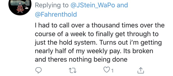 单位服务贸易出口对就业的拉动作用显著高于货物出口,但服务贸易总额占比少。 我们做最最悲观的估算,如果欧美防控失败,影响持续到2季度结束,每个月萎缩的额度都和1-2月出口同比减少的607亿美元相同,总出口额会减少1821亿美元,按2017年每百万美元货物贸易出口拉动的40.3人次就业粗略估算, 总共影响733.9万人的就业岗位 。这是最大峰值数。如果欧美防控成功,就不会出现这样的事情。 全球同此凉热,嘲笑美国经济衰退是没有意义的,很多家庭的生存和发展都得益于全球化的成果、得益于欧美的消费市场。 虽然中国有广大的农村作为退路,吸收大批的失业人口。 在失业率急剧上升期间,美国政府给每个家庭直接发钱,其实不是用来刺激消费,而是用来救急。这笔钱,可以帮失业者还债,可以让上文提到的低收入人群至少能安稳地渡过疫情,减少社会动荡。 周均985美元的失业救济金,折合人民币一个月有27580元。 美国还有食品券可以领,金额不低于普通人正常的伙食费。领不到食品券,还有食品银行、慈善机构每天在免费发放食物,这次疫情期间很多州都增加了免费食品的发放站点,同时还有富豪们捐赠物资给食品银行,失业了也不愁吃不起饭。 全球化的大放水,最终只会进一步加大贫富差距,富人的资产受益,更多的中产和穷人加速坍塌。 所以我们才反复倡议,中国应该加大对困难群众和低收入群体的救助力度,在特别国债、消费券问题上要优先照顾这一群体。 无人拥有先知经验,所有人都在摸着石头过河,最终我们能否从这场危机中携手走出,不止取决于人类的智慧,还有善良。 Americans hit by economic shocks as confusion, stumbles undermine Trump’s stimulus effort 3. The Wall Street Journal. Record 6.6 Million Americans Sought Unemployment Benefits Last Week