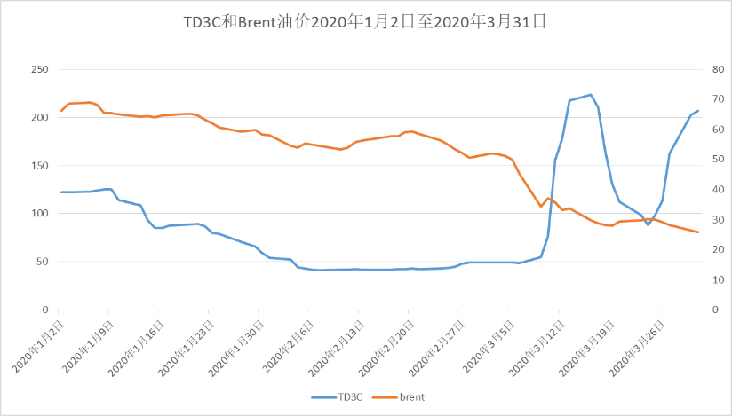 上图即为今年开年以来到3月底的TD3C油轮运价和Brent行情走势。