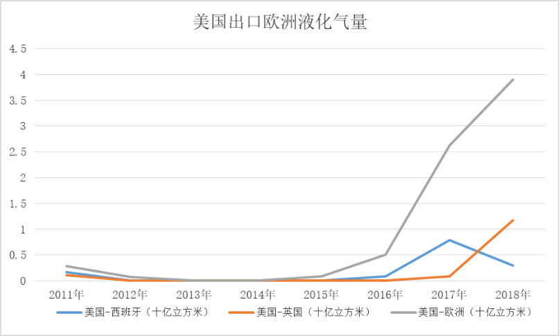 在天然气方面,美国页岩气也以液化天然气形式积极攻入欧洲天然气市场,抢占俄罗斯管道气市场份额。如下图所示,美国近年对欧洲液化天然气出口呈直线增长。