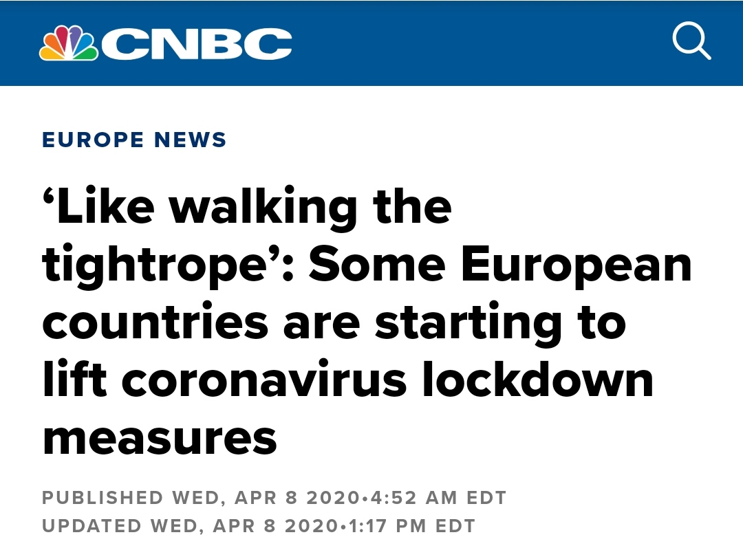 有媒体把欧洲政府的解封措施比喻为走钢丝