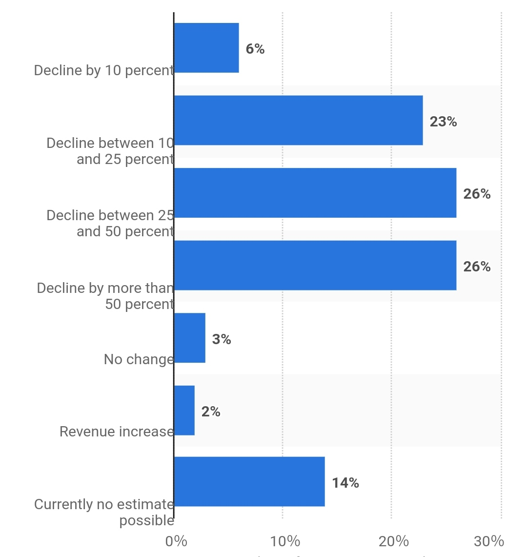 结果显示,有26%的公司预计,2020年收入要减少50%以上,仅有2%的公司认为收入会上升。