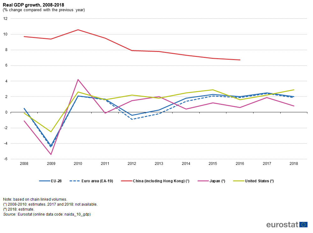 2008—2018年,欧盟、欧元区、中国、日本、美国GDP增长率