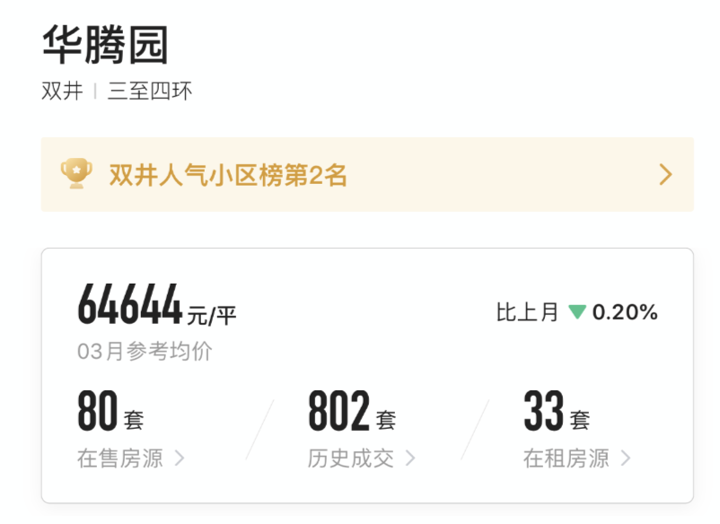 从图中可以看出,华腾园的均价为64644元/平米,一般来说,小区均价代表了小区中户型和楼层为中上的房子。