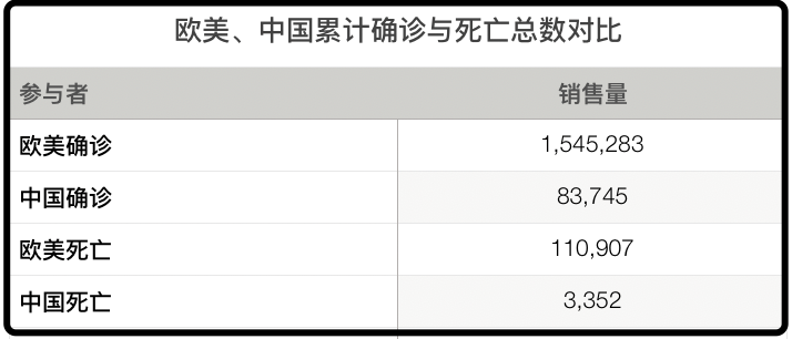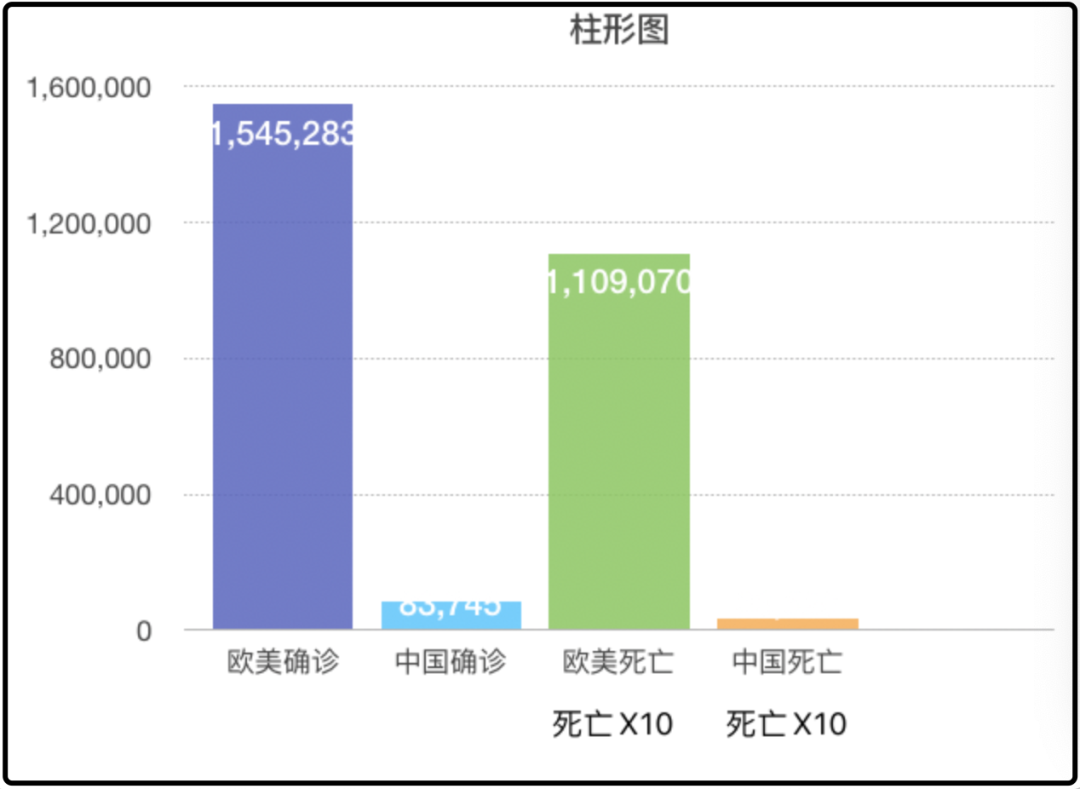 这是一个荒诞的世界,欧美的政客和资本家们,因为自己的傲慢和无知,酿造了一场本可以避免的超级灾难。截止4月14日,人口仅13亿的欧美,累计确诊新冠病毒人数超150万,死亡人数超11万,累计确诊人数约为14亿人口的中国的19倍,累计死亡人数是中国的33倍。▲欧美与中国疫情数据“可视化”对比,为方便比较,柱形图中死亡数据均乘以10倍。