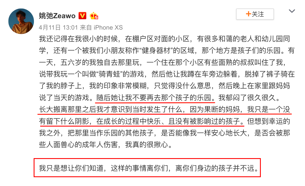 在鲍毓明案曝光时,95后男艺人姚弛发了条微博,分享了自己童年被“骑青蛙”经历: