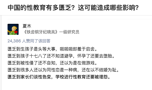 知乎上有个问题:中国性教育的匮乏,到底会造成怎样的影响?