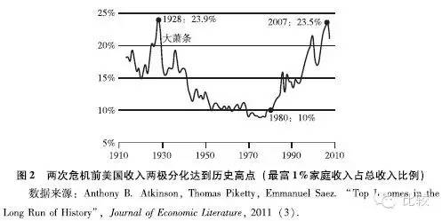 两次危机发生前的另一个共同特点,是较少数的人占有较多的社会财富(见图2)。大萧条期间所表现出的,是私人占有和社会化大生产之间的矛盾,表现形式是实体经济产能过剩和有效需求不足。这一次危机则与全球化、互联网和知识经济的发展、经济虚拟化程度提升、不同国家人口结构的变化有更多关系。但最突出的表现是,生产资料名义所有权和实质支配权分离,权力集中到虚拟经济领域极少数知识精英手中。分配差距也不仅表现在一个国家内部不同的社会群体之间,而且表现在传统的发达国家和新兴市场国家之间。在全球化和互联网全面发展的过程中,世界经济形成了相互依赖的三角形循环,新兴市场国家成为全球制造中心,资源富足国家提供原材料和能源,发达国家通过负债消费,拉动新兴市场国家产能利用。虽然形式上的变化很多,但是产能过剩和有效需求不足的矛盾仍然是主要矛盾。