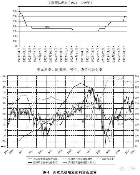两次危机都与货币政策相关联。在两次危机之前,最方便的手段是采取更为宽松的货币信贷政策。大萧条前,泛滥的信贷政策引起了股市的泡沫和投机的狂热;在这次危机前,美联储极其宽松的货币政策、金融放松监管和次级贷款都达到前所未有的水平,使得经济泡沫恶性膨胀。在经济泡沫导致消费价格上涨的压力下,货币当局不得不采取紧缩货币政策,从而捅破了泡沫,改变了投机者的心理预期,使得迟早发生的事终于发生(见图4)。