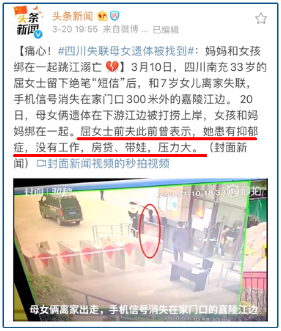 在四川南充,屈女士携幼女离家出走,随后失联。监控视频显示,母女俩均戴着口罩,7岁的女儿蹦蹦跳跳很开心地走出小区大门,母亲则紧跟其后。母女俩的手机信号消失在嘉陵江边,过了几天,有人在嘉陵江下游将遗体打捞出来,发现母女俩人的遗体是紧紧绑在一起的。