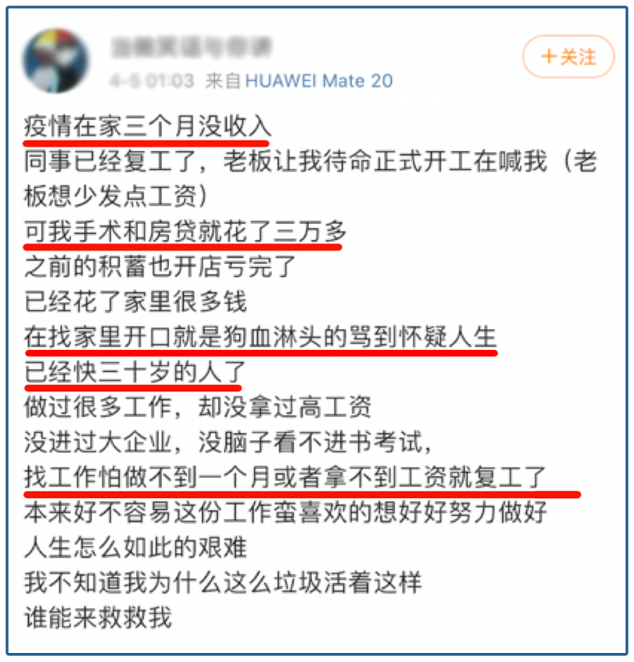 说实话,大家都有点忧心忡忡。但要说现在境遇最扎心的一群人,还是那些几个月没收入的人,如果还欠着钱,那内心真是很崩溃了。
