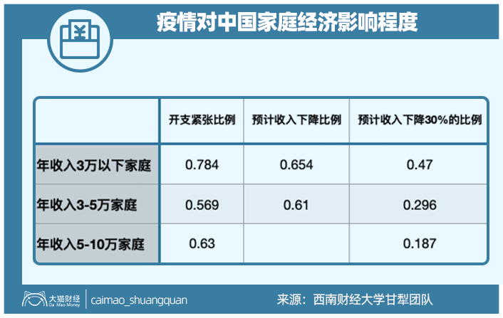 一直在对家庭金融进行调查研究的西南财经大学甘犁教授团队前不久做了个报告,结论不乐观,因为疫情,感到开支紧张、预计收入下滑的家庭比例非常大: