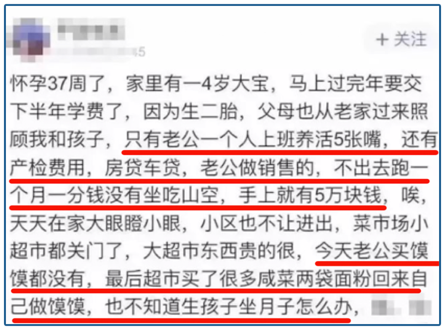 收入说没就没,老公去超市买馍馍都舍不得了,生孩子做月子都难。