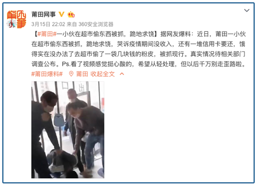 莆田也有个小伙子,没钱没收入,饿急了去超市偷了一袋几块钱的粉皮,被抓了个现行,被抓之后跪地求饶,不断哭诉,很多人看了都觉得挺心酸的。