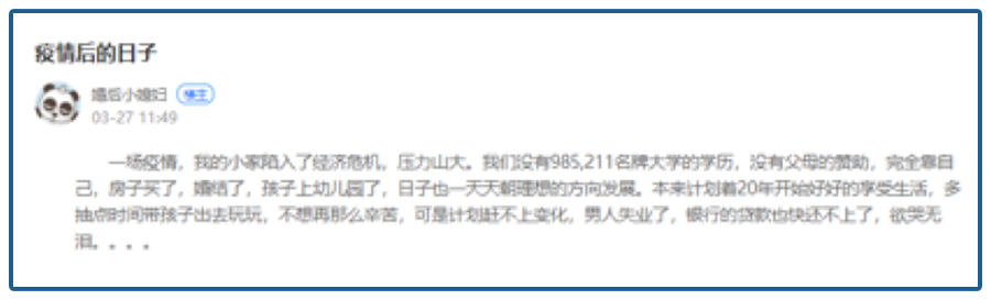 “一场疫情,让我的小家陷入了经济危机。我们靠着自己的努力买房、结婚,孩子也上了幼儿园,日子一天天朝理想状态发展。可计划赶不上变化,男人失业了,银行贷款也快还不上了,欲哭无泪......”