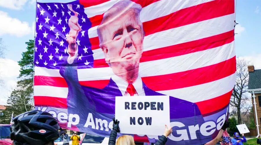 4月18号那天特朗普像个自由斗士一样,在他的社交媒体账号上用大写字母写了三句口号:解放密歇根州!解放明尼苏达州!解放弗吉尼亚州!抗议者们收到来自总统的鼓励,闹得更带劲了。
