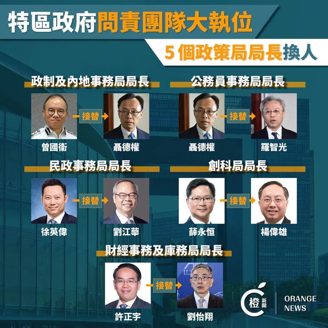 二是22日正式宣布的香港特区政府问责团队的人事调动,5个政策局局长换人,其中一位局长获得平调,其他4位离任。